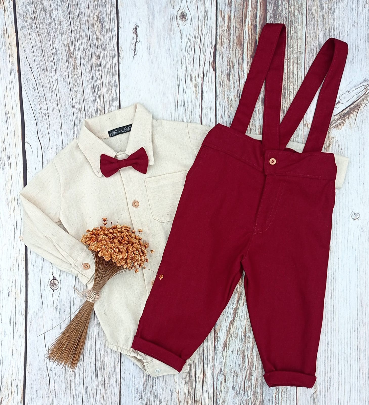 O Look Anthony é composto por body de manga comprida com gola em linho natural, calça com suspensório removível e gravata borboleta em linho na cor marsala.