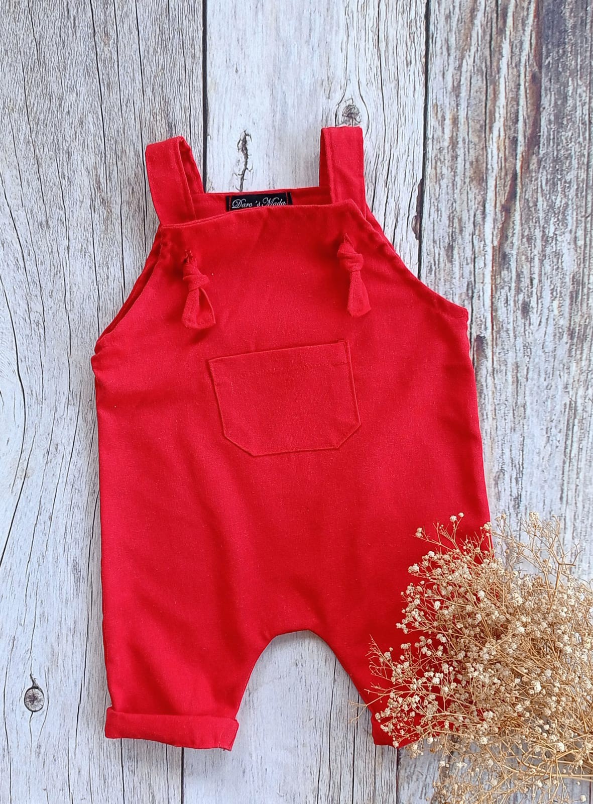 A jardineira Bryan é confeccionada em linho com detalhes em nozinho na alça.