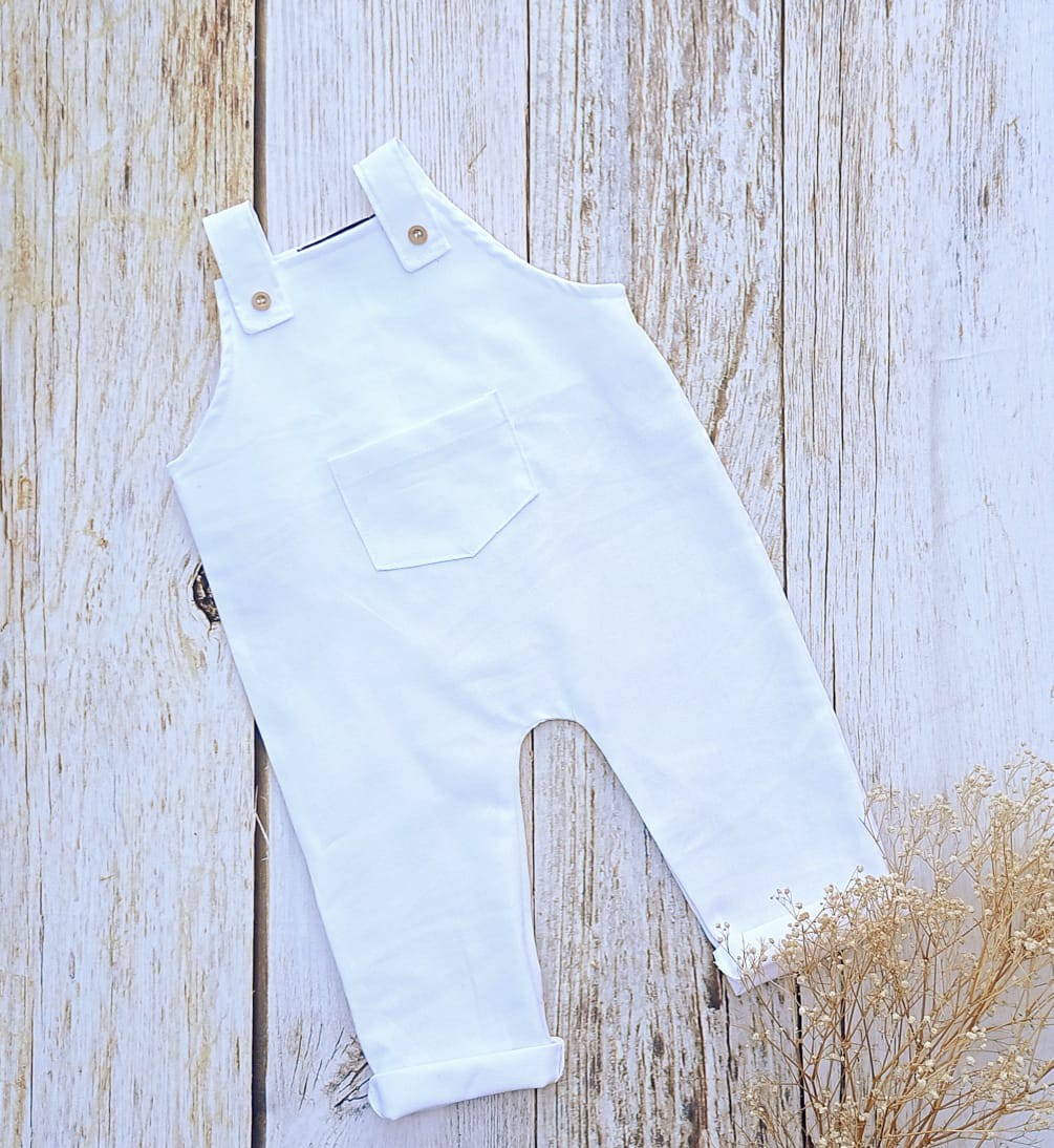 A jardineira angel longa é confeccionada em linho branco com detalhes em botões bege.