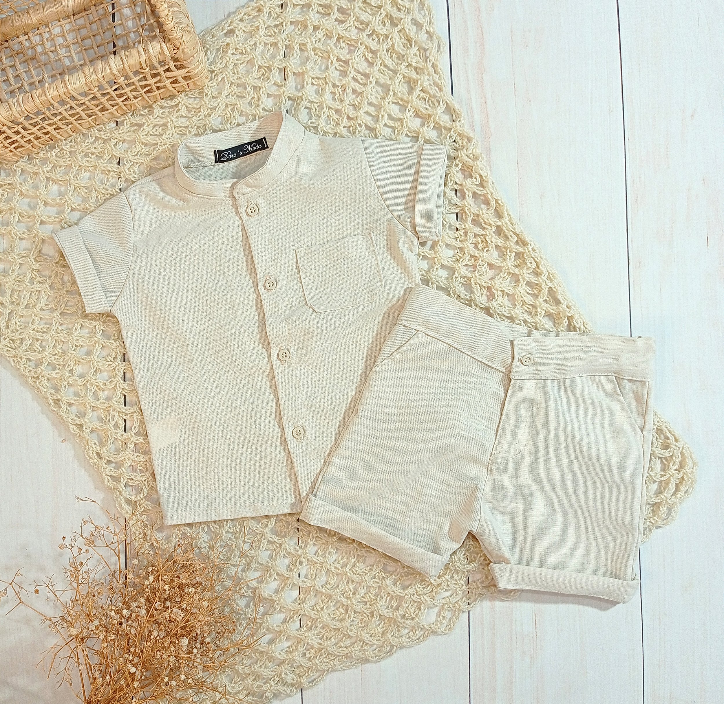 O Look Arthur é composto por camisa de manga curta e bermuda em linho na cor natural.