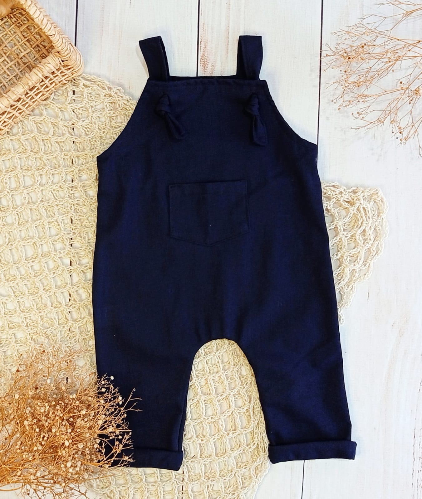 A jardineira azul marinho longa é confeccionada em linho natural com detalhes em nozinho na alça.