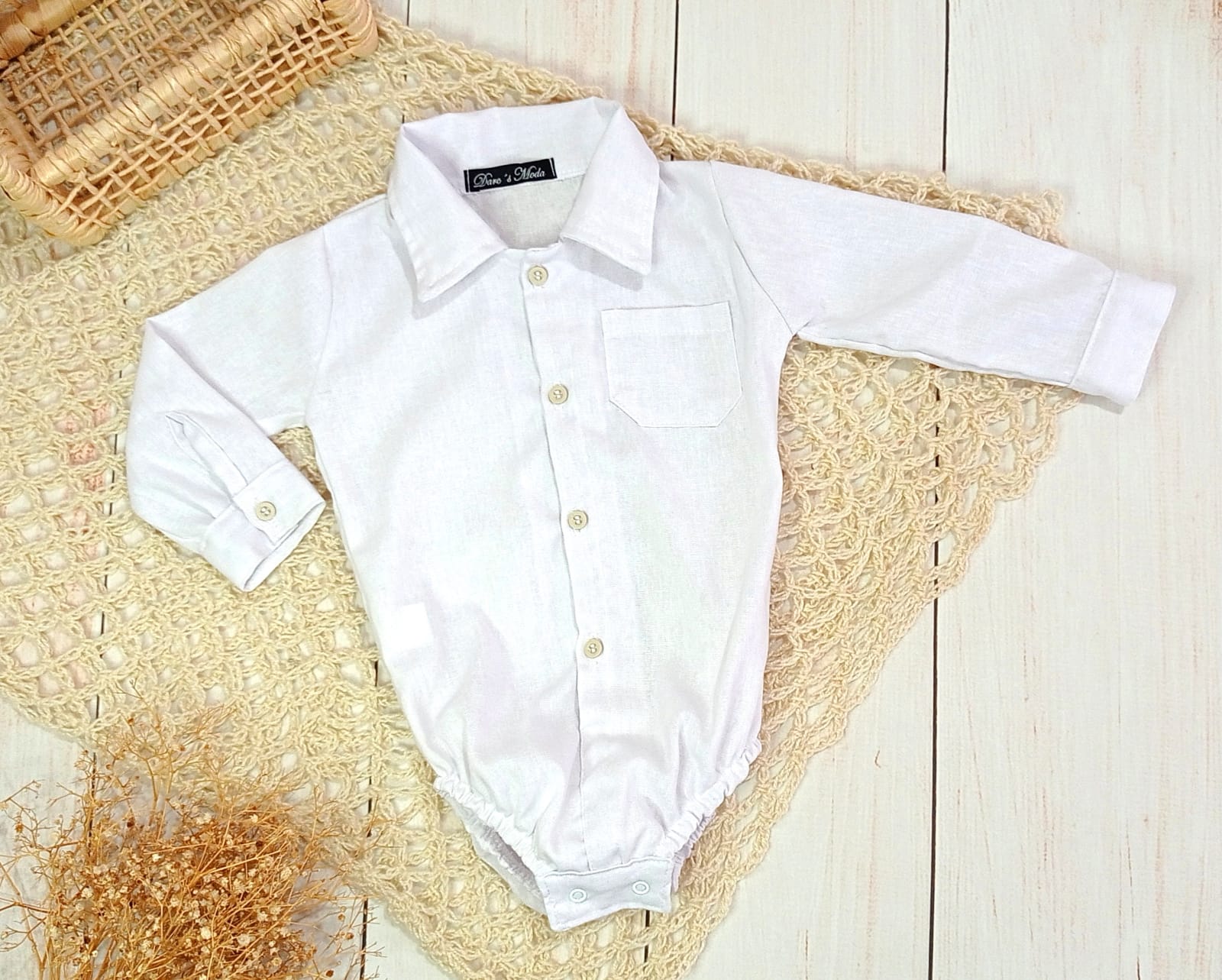 O Body Pietro é confeccionada em linho branco com botões, manga longa e gola.