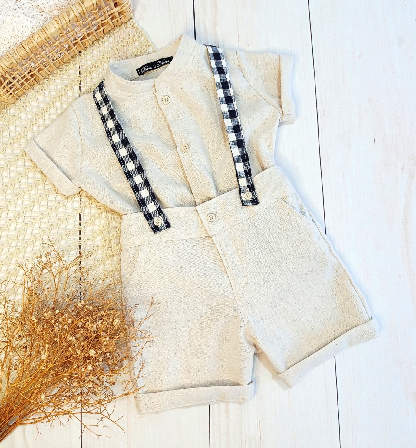 O Look Albert é composto por camisa de manga curta e bermuda em linho natural, suspensórios removíveis em tecido flanelado xadrez.