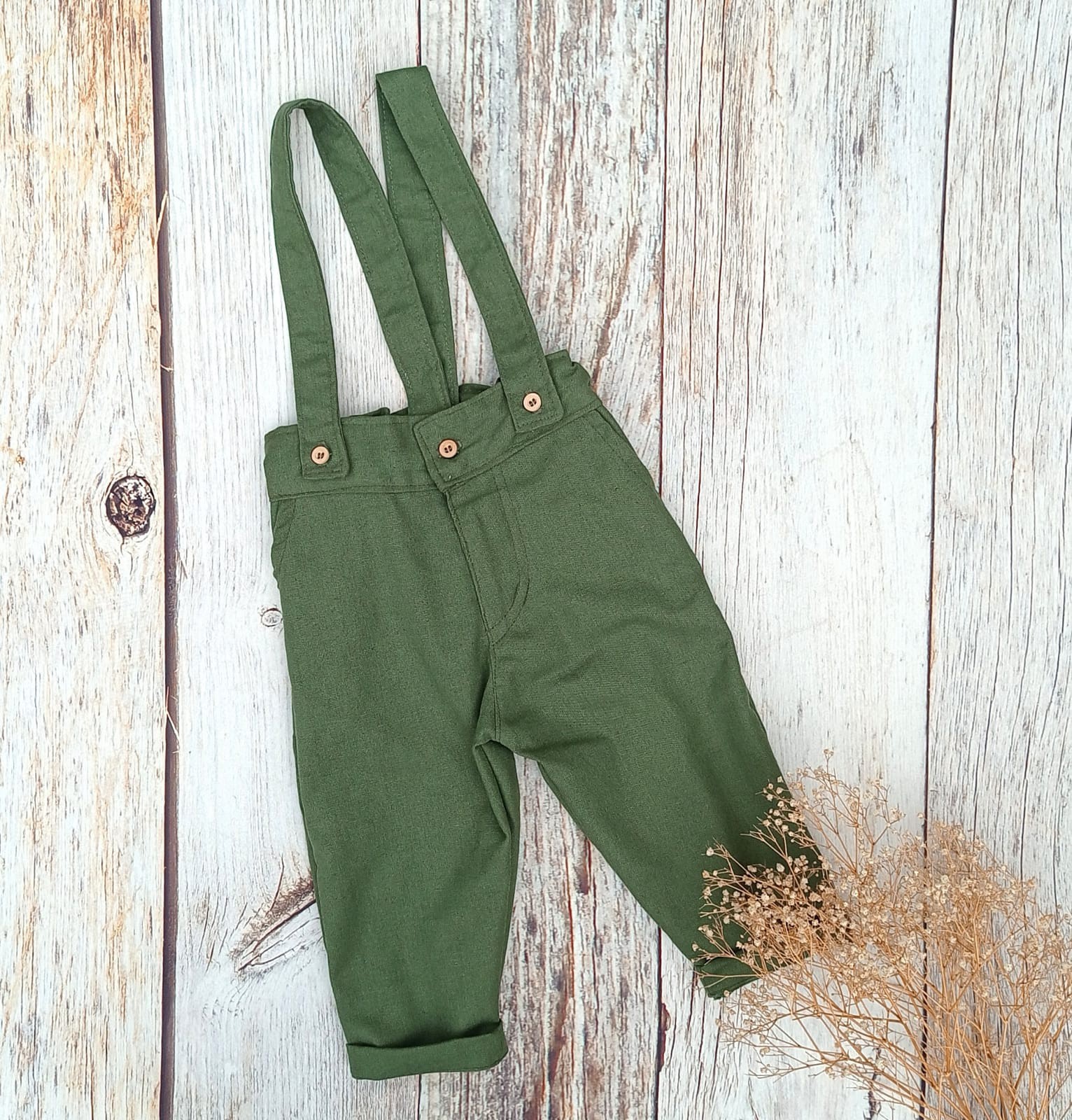 A calça e suspensórios são confeccionados em linho misto, com elástico no acabamento da cintura e regulagem, o que ajuda no ajuste ao corpo, os bolsos frontais são reais.