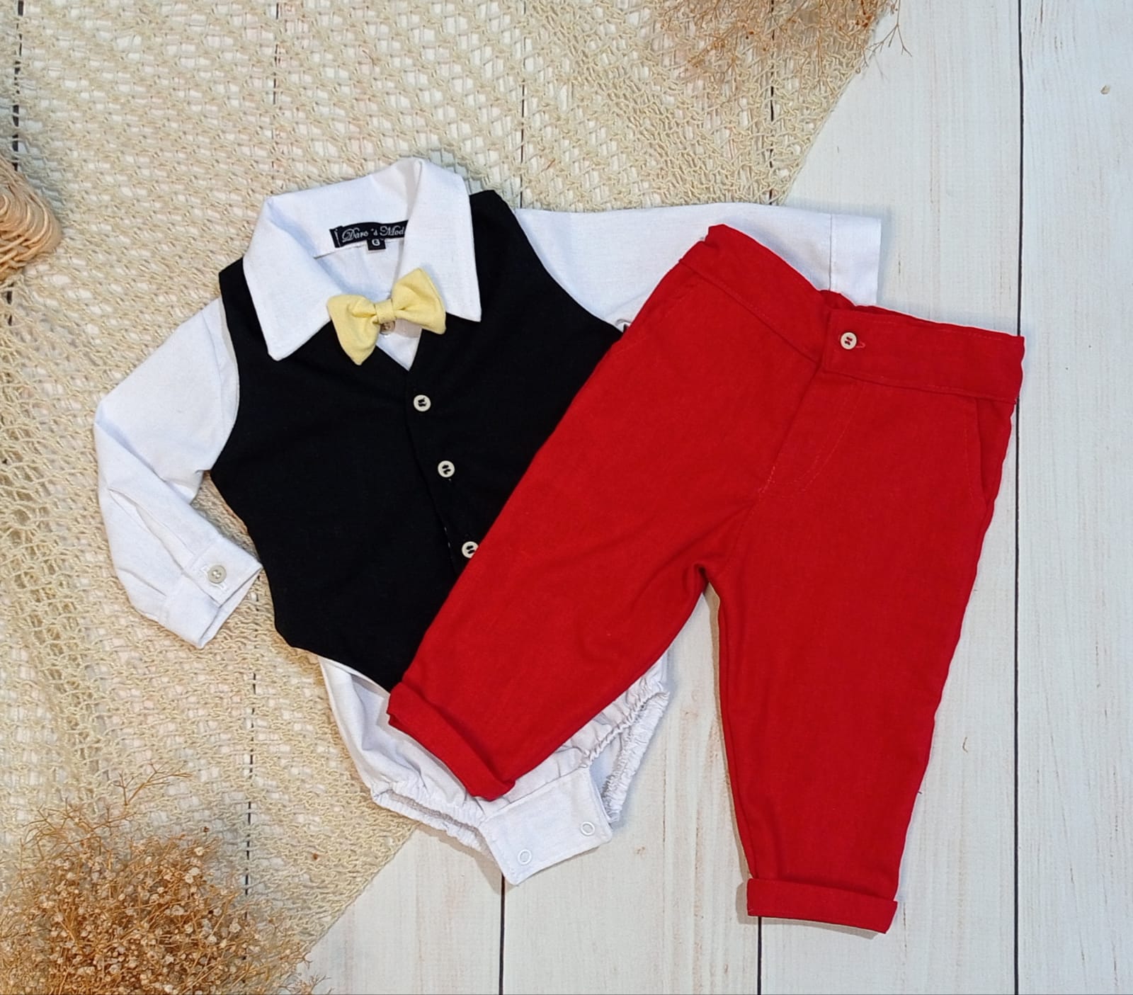 O Look festa Mickey é composto por body de manga comprida em linho branco, calça em linho vermelho, gravata borboleta em linho amarelo e colete em linho preto.