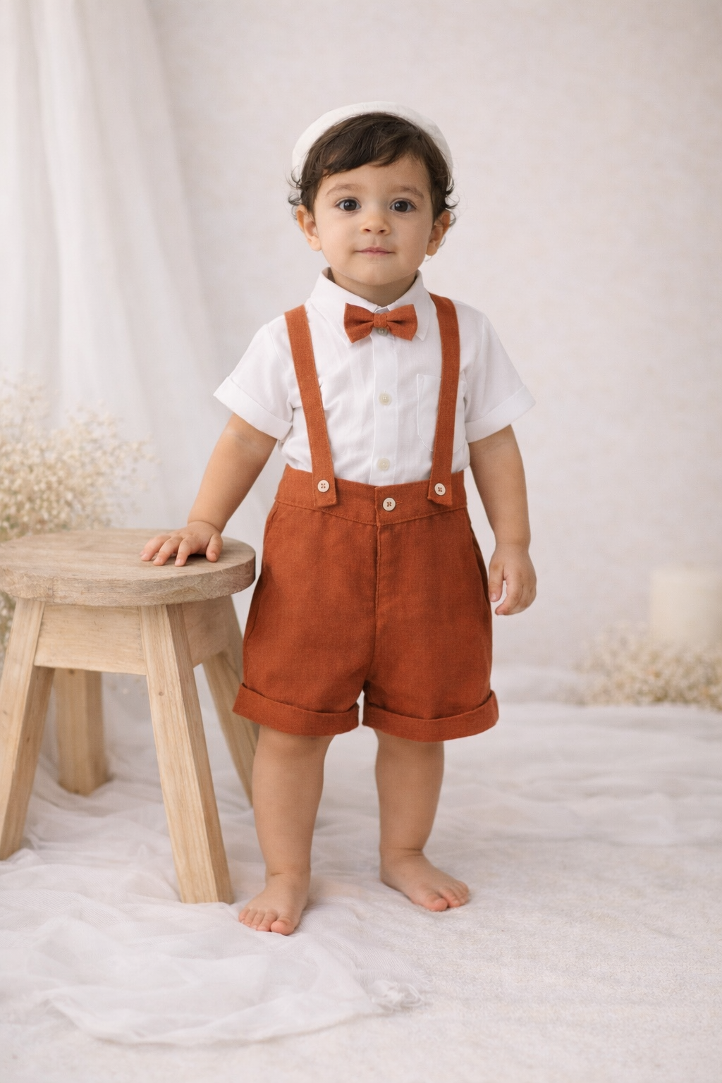 O look Theo é composto por camisa em linho natural, bermuda e acessórios em sarja caramelo. Suspensórios removíveis.