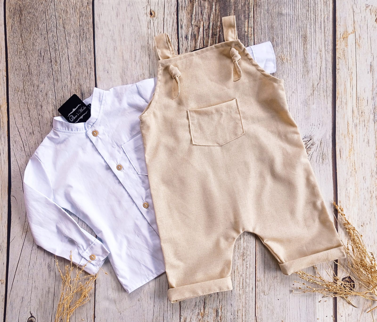 O Look Bento é composto por camisa confeccionada em linho branco de manga longa com gola padre e jardineira curta confeccionado em linho atural.