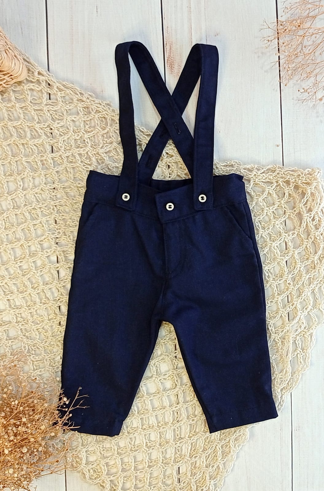 O tom azul marinho da calça e suspensório, são peças coringas que se adequam a qualquer evento.