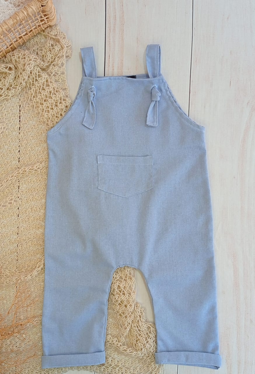 A jardineira azul serenity longa é confeccionada em linho misto azul serenity com detalhes em nozinho na alça.