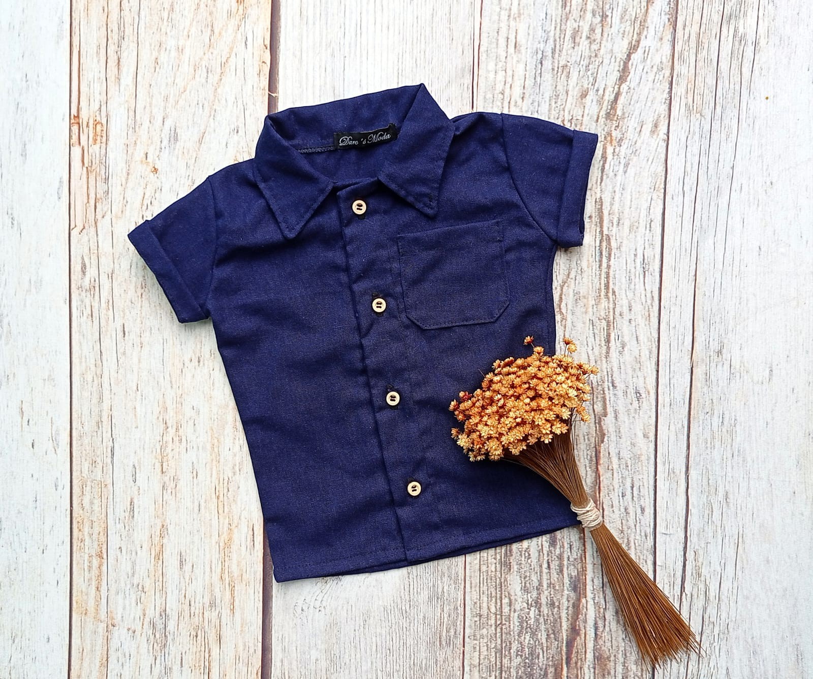 A camisa Guto é confeccionada em linho azul marinho com botões bege, manga curta e gola polo.